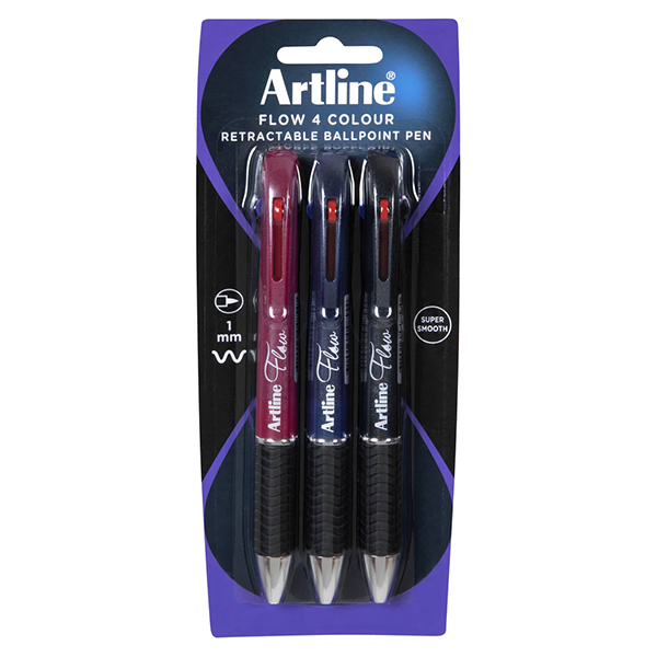 ARTLINE FLOW 4 COLOUR RETRACTABLE PEN ASSORTED PACK 3