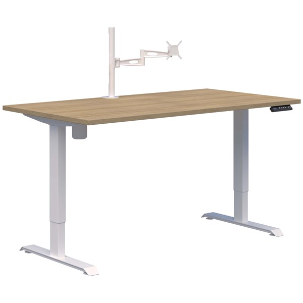 DUO II ELECTRIC DESK W1200 X D700 X H695-1145MM WHITE FRAME CLASSIC OAK WITH METALICON SINGLE MONITOR ARM WHITE