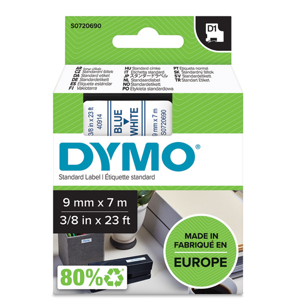 DYMO 40914 D1 LABELLING TAPE 9MM X 7M BLUE ON WHITE