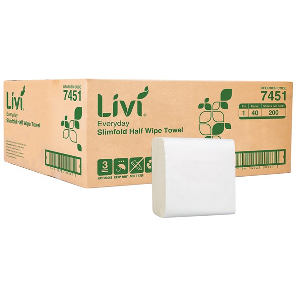 LIVI EVERYDAY HALF WIPE SLIM FOLD PAPER TOWEL 1 PLY 200 SHEET PACK CARTON 40