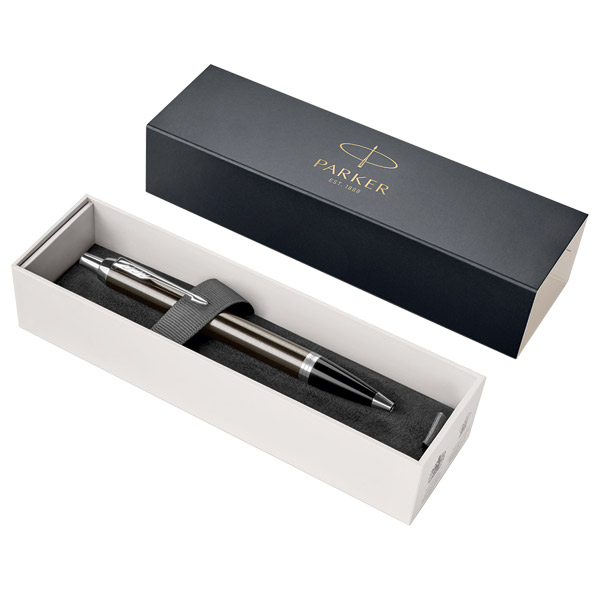 Parker IM Dark Espresso Lacquer Chrome Trim Ballpoint Pen.Expertly crafted stainless steel bodyRed barrelComplemented with stainless steel trimsPresented in Parker hangsell packaging