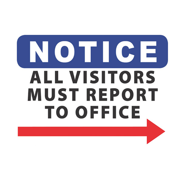 Sign reads Notice All Visitors Must Report to Office with a right arrow symbol